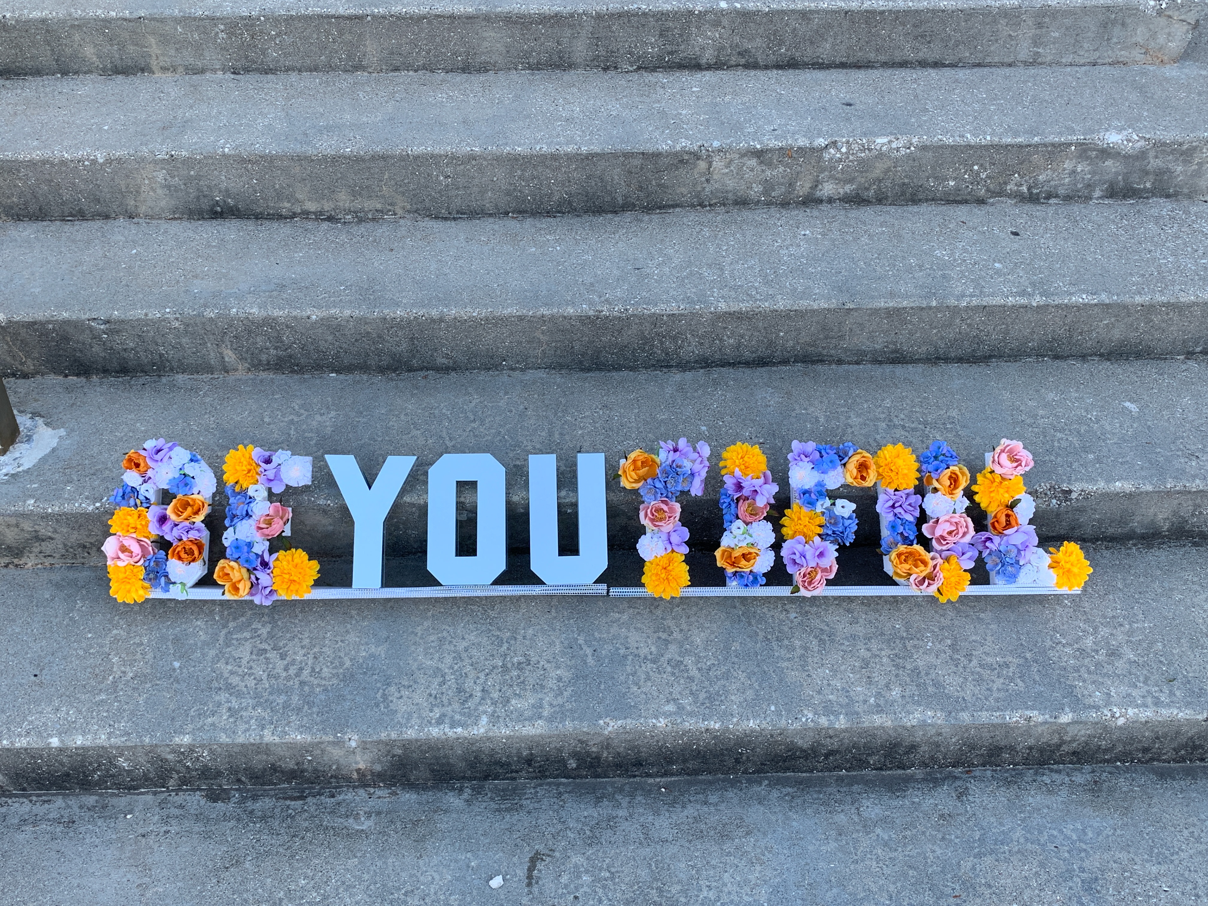 This was another favorite project of mine. It was a typographic sculpture. The point of this project was to make a direct comparison of natures beauty and ones own. It spells out beautiful but with a twist that encourages people to "be you". It is made up of silk florals and mirrors to help tie in the over all theme of the piece.
